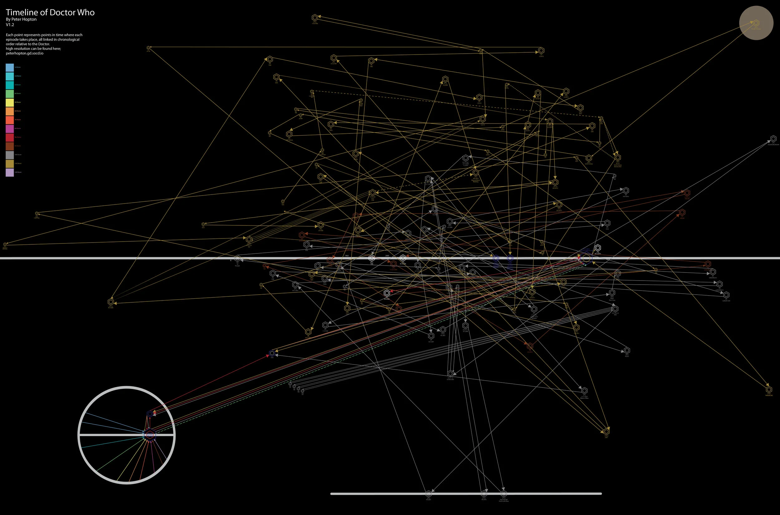 I spent a long time recording all the time zones that the current generations of Doctor Who (Christopher Eccleston, David Tennant and Matt Smith) have visited up to the 50th anniversary special (which made life a lot more complicated). Tracking 3 Doctors was complex, but showing all 13 would take a lifetime.